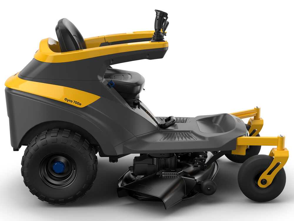 STIGA Gyro 700e est une autoportée à batterie axiale avec éjection latérale commandée par joystick et transmission drive-by-wire avec technologie STIGA Direct Drive.